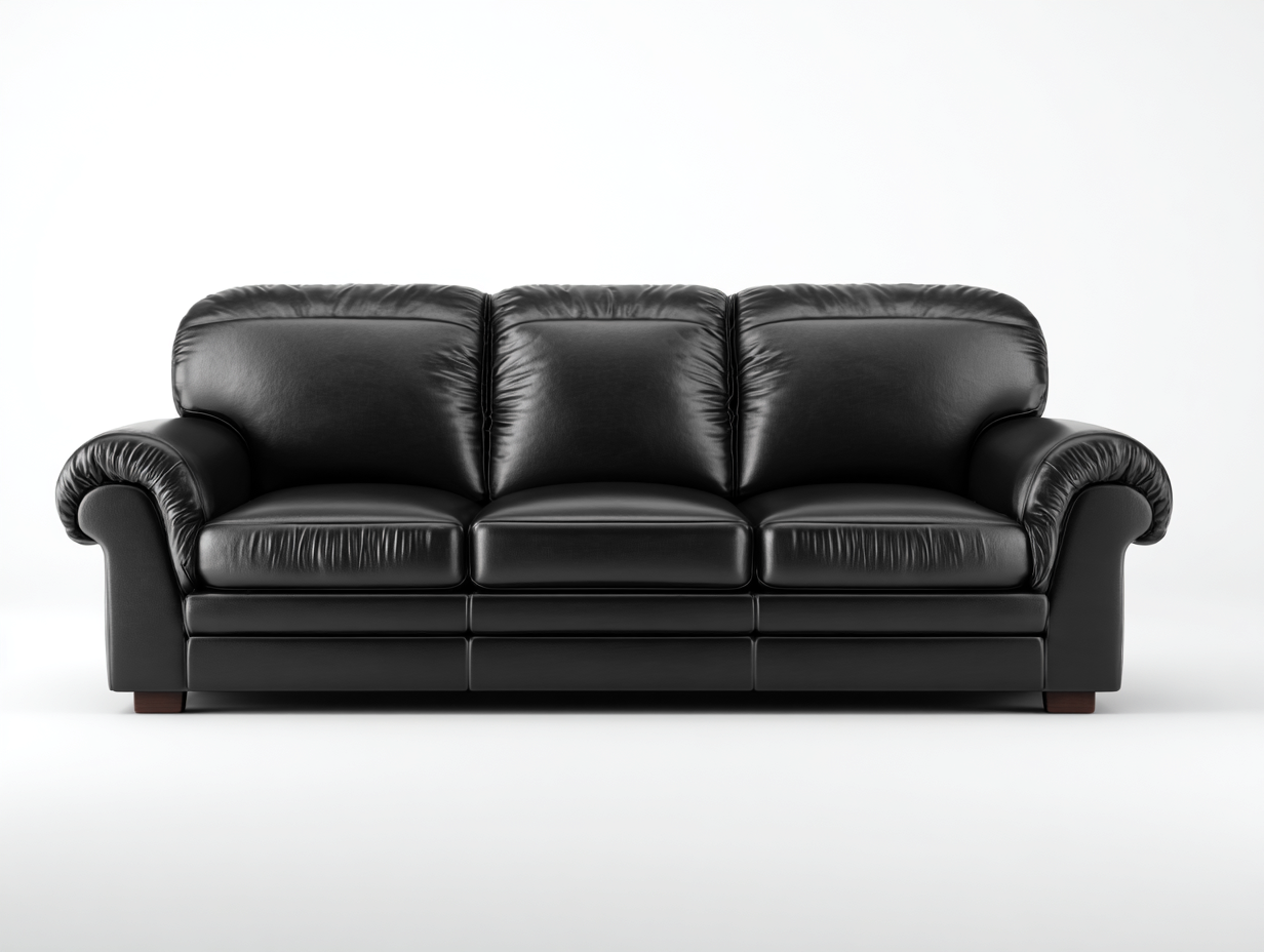The sofa is upholstered in black leather with a smooth surface finish. The padded structure enhances comfort, while the solid internal frame supports long-term stability and consistent shape.