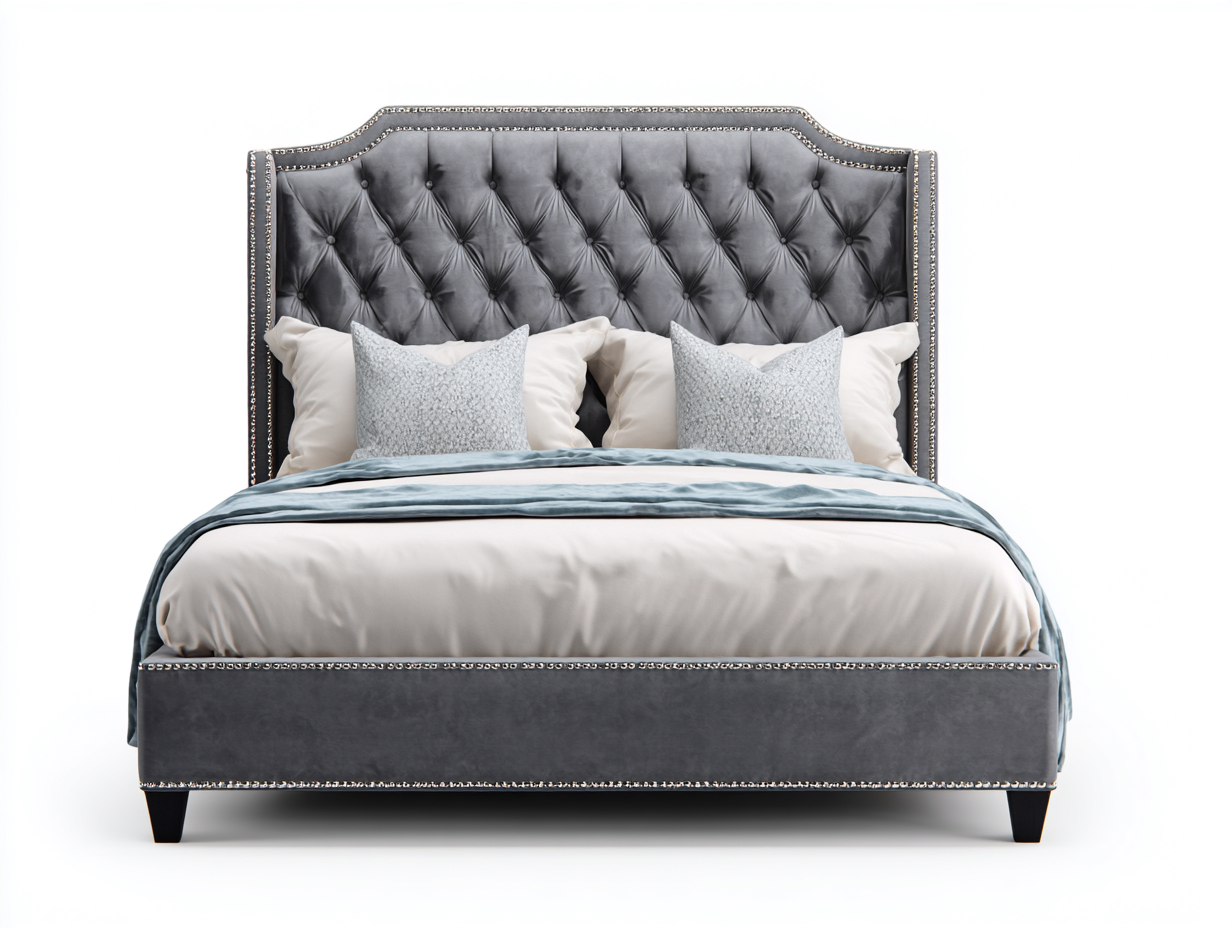 This double bed features a fully upholstered frame with a tall button-tufted headboard, offering both visual elegance and comfortable support for everyday bedroom use. The refined silhouette enhances classic and contemporary bedroom interiors alike.