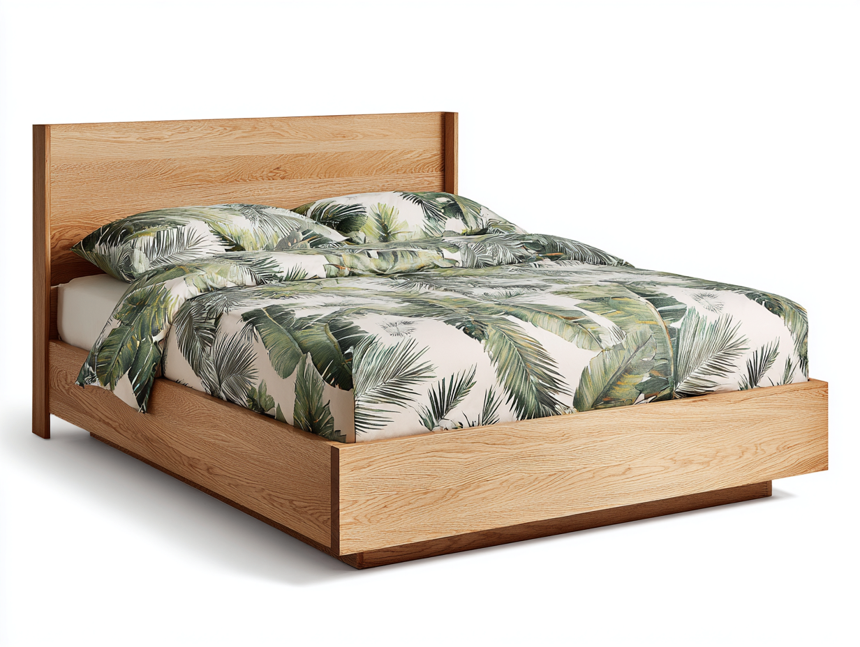 The sturdy wooden frame offers dependable support for a standard double mattress. The straight headboard provides comfortable back support for reading or relaxing, while the low-profile base enhances ease of access and visual balance.