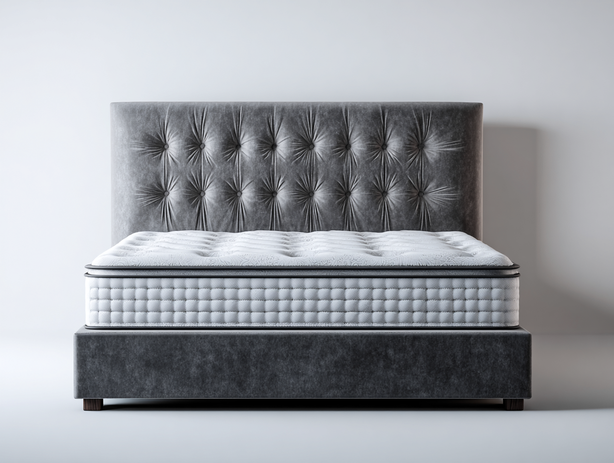 The bed frame is upholstered in fabric with a grey finish, combined with a solid internal structure to ensure stability and durability. The headboard features detailed tufted craftsmanship, offering a soft touch and a visually elegant appearance.