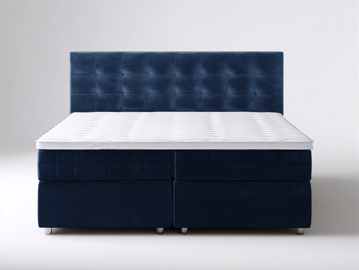 The bed frame is upholstered in soft fabric finished in a navy blue tone, combined with a sturdy internal structure for reliable support. The padded headboard is carefully stitched to provide a smooth surface and consistent appearance.