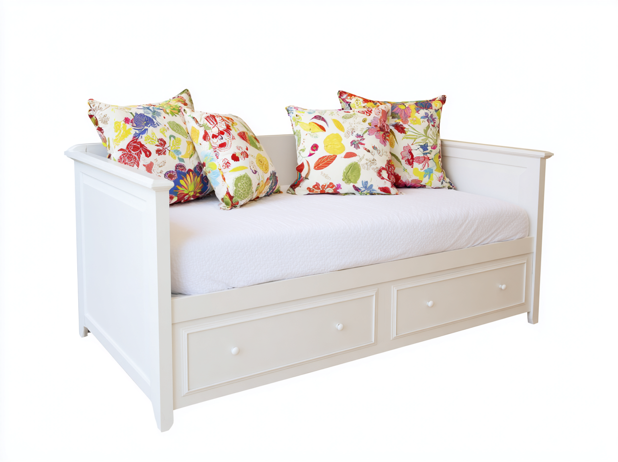 Constructed from solid wood with a white painted finish, the frame features smooth surfaces and well-finished edges. The structure is designed for stability and durability, supporting both seating and sleeping use.